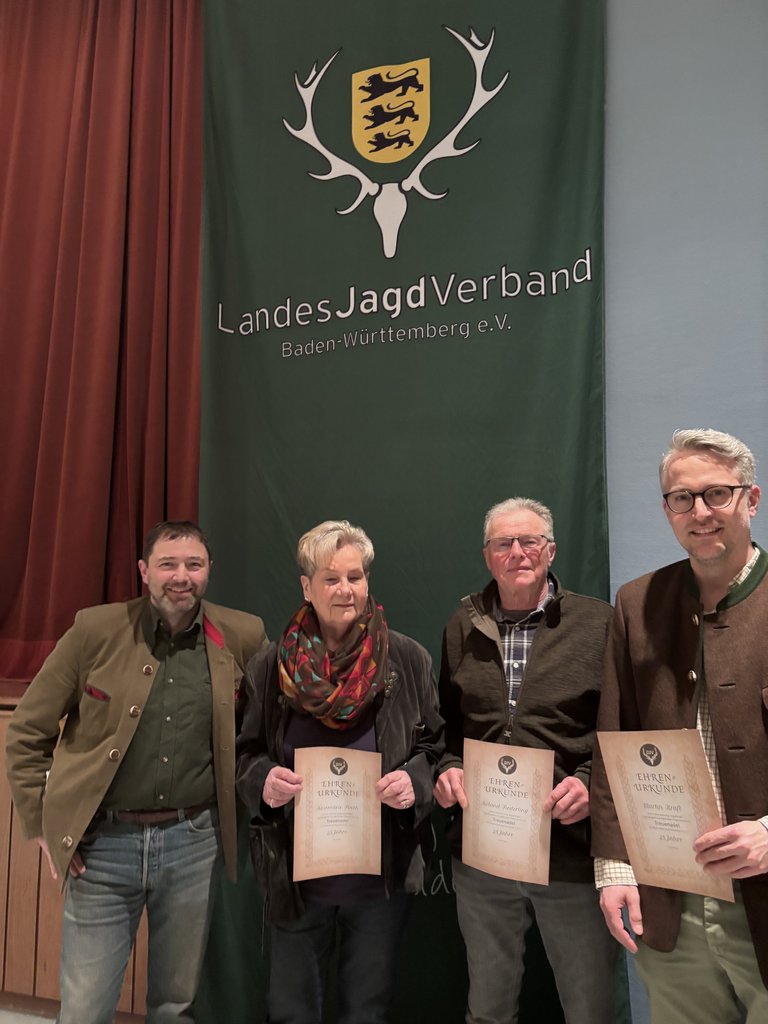 Günther Riedl, Schriftführer vom Bayrischen Jagdverband aus Marktheidenfeld, Benjamin Gut, Gastredner vom Landesjagdverband Baden-Württemberg, Frau Marieke Plate, Leiterin des Forstamts Tauberbischofsheim, Florian Dietzel, Kreisjägermeister aus Bad Mergentheim, Vanessa Bimmerlein, Hundeobfrau der Kreisjägervereinigung Tauberbischofsheim, und Franz Rudlof, Bezirksbläserobmann. Entschuldigt hatten sich Herr Carlo Hatnagel, Leiter der unteren Jagdbehörde, und Bürgermeister Schregelmann. Frau Plate richtete im Anschluss an KJM Metz Begrüßung noch Grußworte an die Versammlung.